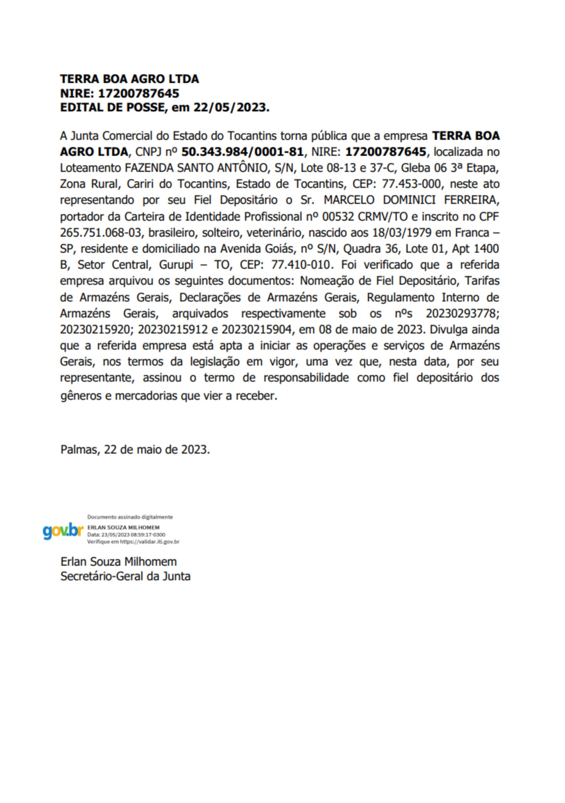 TERRA BOA AGRO LTDA EDITAL DE POSSE