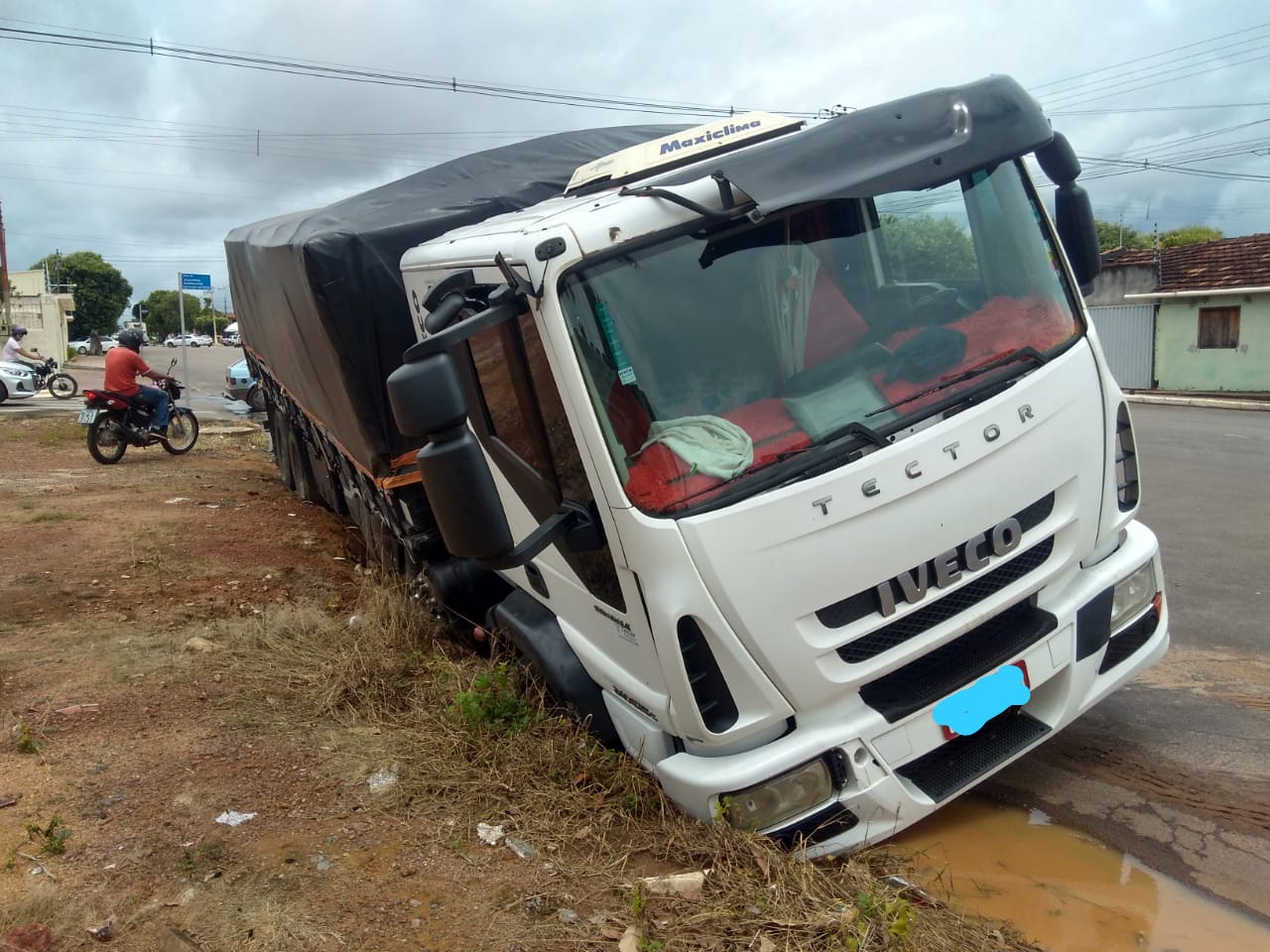 Um caminhão de carga afundou uma de suas rodas no acostamento de uma avenida no centro de Gurupi.