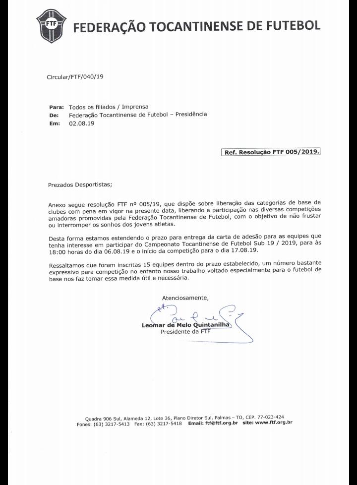 Em uma circular expedida nesta sexta – feira (02) a Federação Tocantinense de Futebol liberou a participação de clubes que estão apenados pelo tribunal e os clubes terão até terça-feira (06) para entregar a carta de adesão.