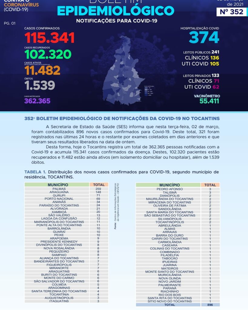 Atualmente, o Tocantins contabiliza 362.365 pessoas notificadas com a Covid-19 e acumula 115.341 casos confirmados. Destes, 102.320 pacientes estão recuperados, 11.482 pacientes seguem em isolamento domiciliar ou hospitalar e 1.539 pacientes foram a óbito.
