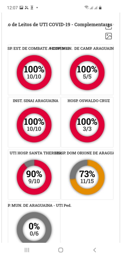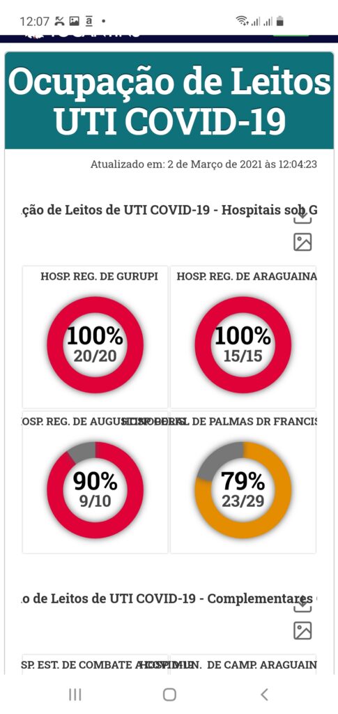 Dos 896 novos casos, 652 foram detectados por RT-PCR, 37 sorologia e 207 por teste rápido. Palmas registrou hoje 259 novos casos, Araguaína 148, Gurupi 71 e Porto Nacional 69. A situação é preocupante onde 100% dos leitos de UTI COVID-19 dos Hospitais Regionais de Gurupi e Araguaína encontram-se ocupados.