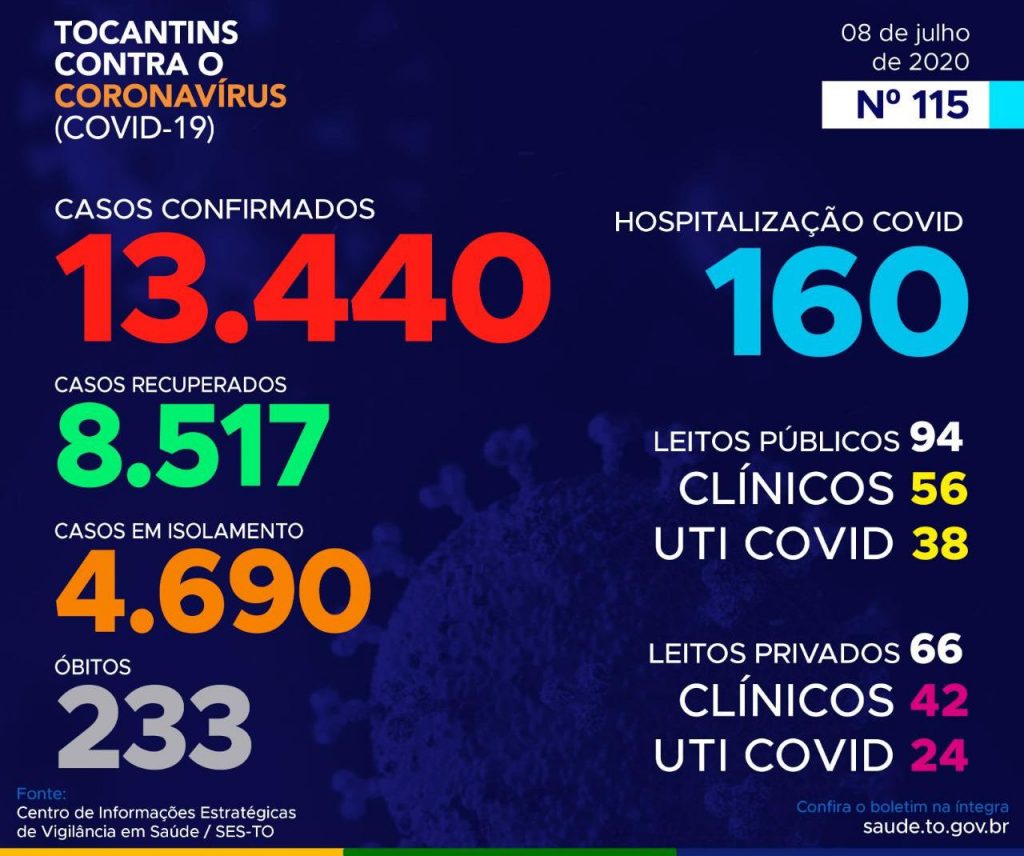 O Boletim Epidemiológico desta quarta-feira, 08, mostra Palmas com 132 novos casos, Araguaína com 49, Araguaçu 32, Porto Nacional com 26, Augustinópolis e Gurupi com 19, respectivamente. Hoje o Tocantins contabiliza 13.440 casos confirmados da doença, destes 8.517 pacientes estão recuperados e 4.690 estão ainda ativos (em isolamento domiciliar ou hospitalar), além de 233 óbitos.