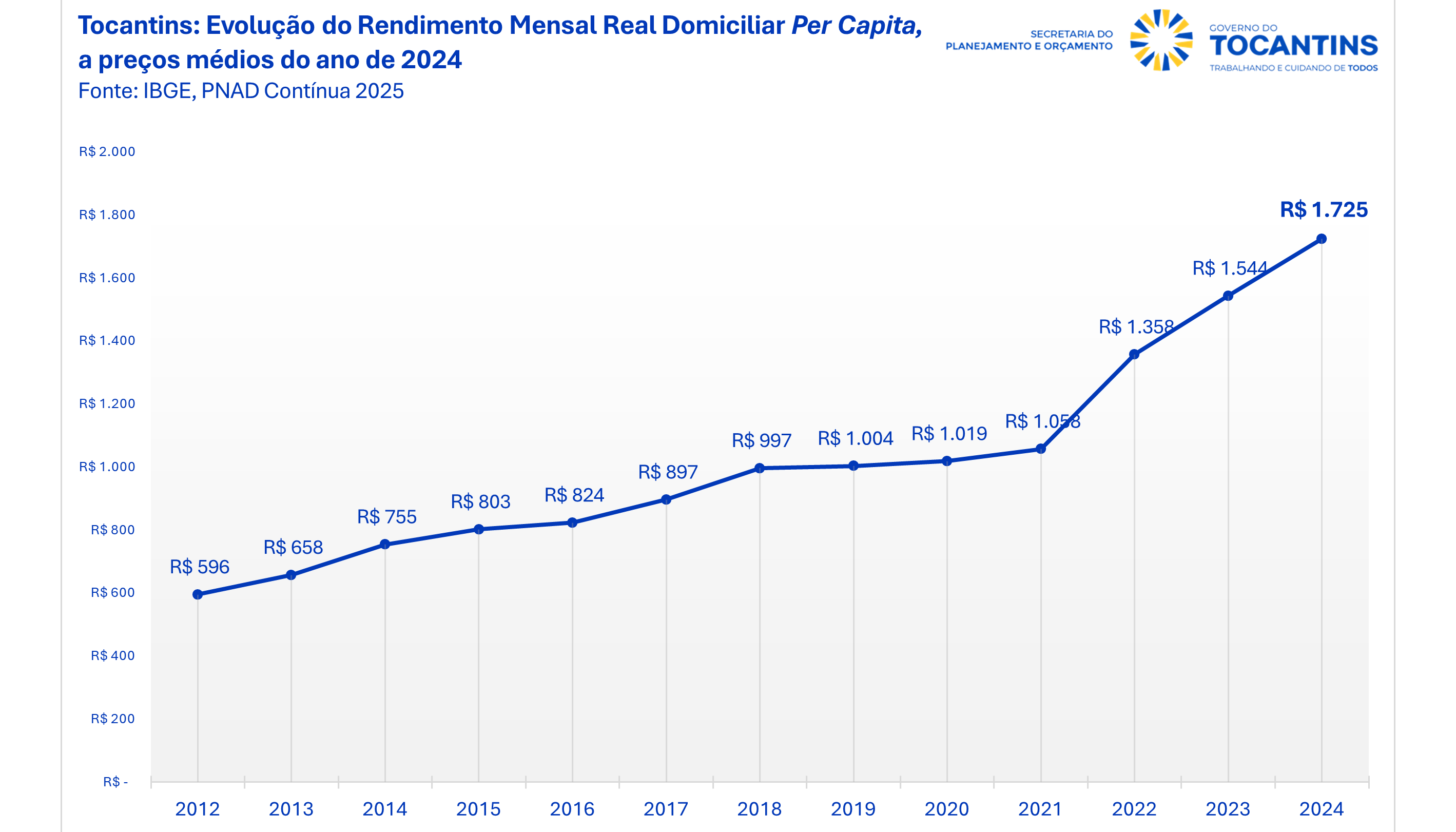O rendimento médio mensal domiciliar per capita no Tocantins alcançou o maior valor desde o início da série histórica iniciada em 2012, chegando a R$ 1.725 em 2024, um crescimento de 11,72% em relação a 2023. Esse rendimento coloca o estado em 1º lugar no ranking de maior rendimento médio das regiões Norte e Nordeste; e o 13º rendimento do país. Os dados são da Pesquisa Nacional por Amostra de Domicílios Contínua (Pnad Contínua), divulgada pelo Instituto Brasileiro de Geografia e Estatística (IBGE).