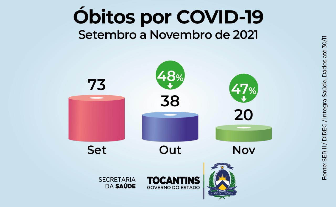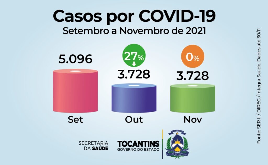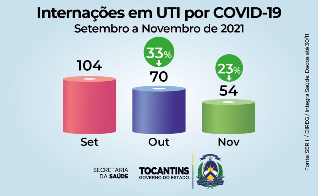 Conforme relatório emitido pelo Integra, em setembro de 2021, o Tocantins teve 5.096 casos confirmados de Covid-19 e seguiu em queda, com 3.728 em outubro (redução de 27%) e manteve o índice em novembro. Já nas internações em leitos de Unidade de Terapia Intensiva (UTI), o arrefecimento foi mais acentuado: foram 104 em setembro, 70 em outubro (-33%) e 54 em novembro (-23%).