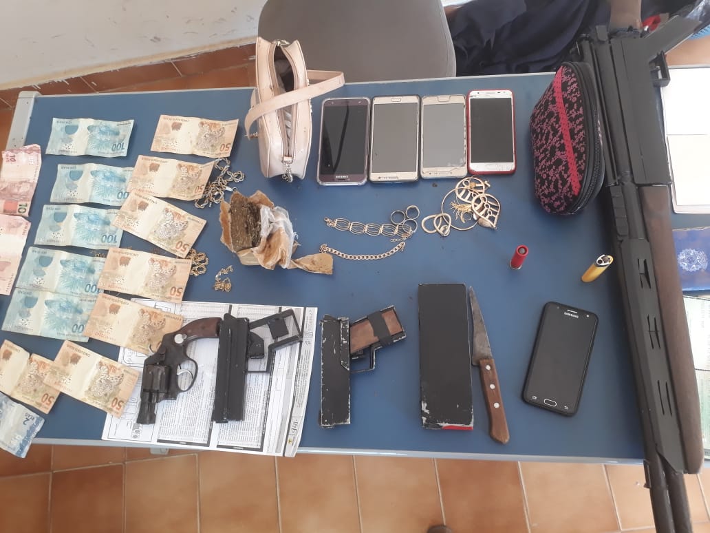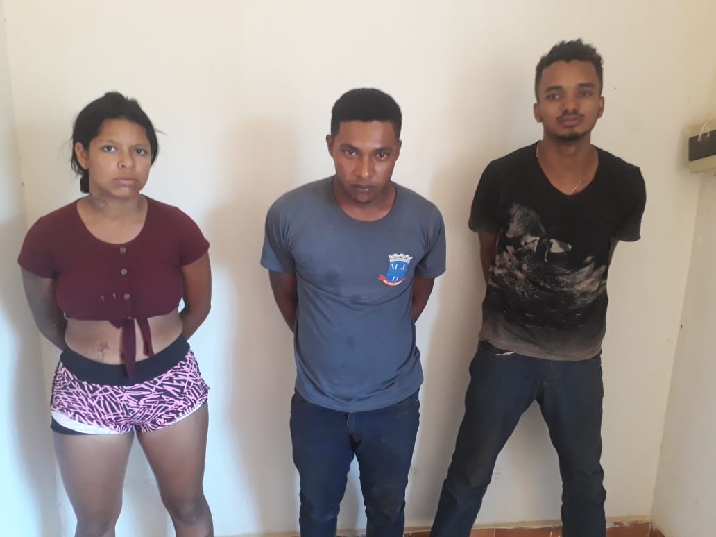 Dois homens e uma mulher foram presos após abordagem da Polícia Militar, os suspeitos estavam em um carro e com eles foram apreendidos dois simulacros, um revólver e uma espingarda, além de maconha.