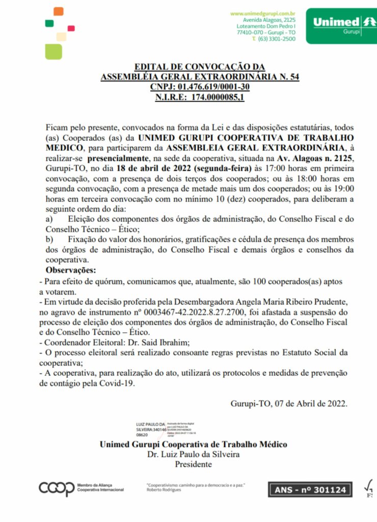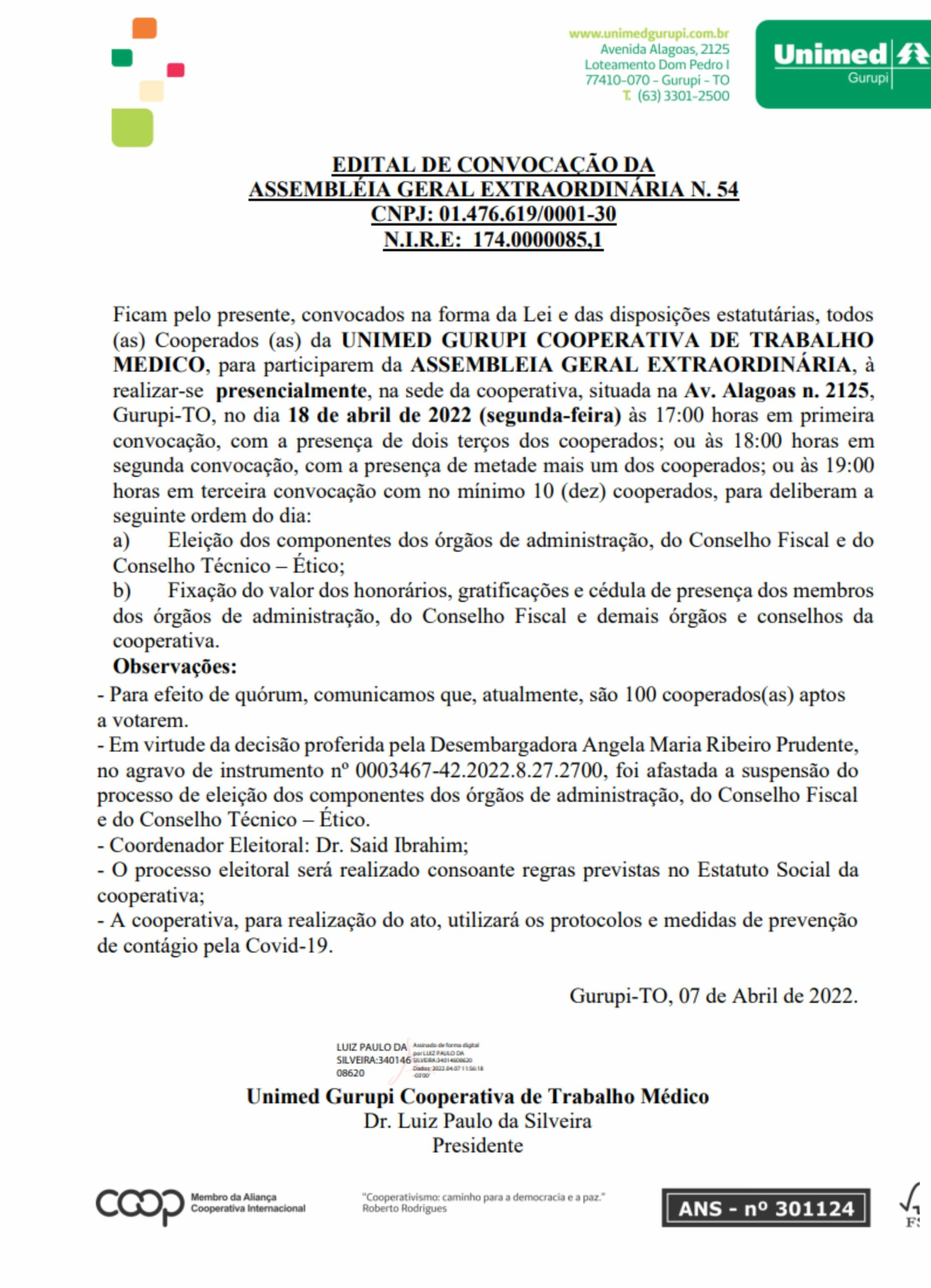 Lar»Cidades»UNIMED GURUPI | EDITAL DE CONVOCAÇÃO DA ASSEMBLÉIA GERAL EXTRAORDINÁRIA