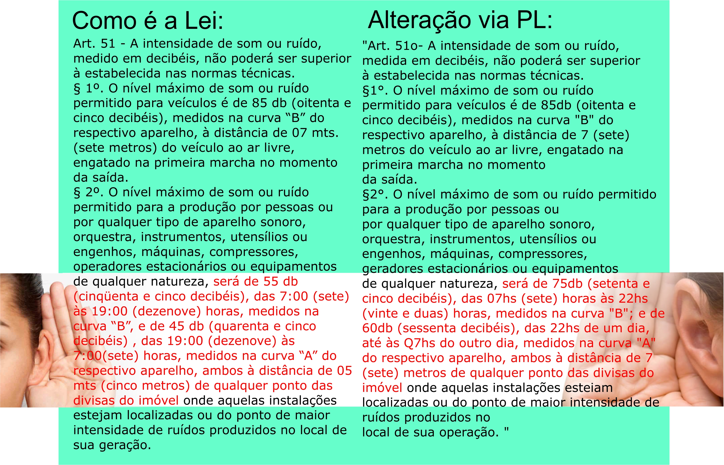 A mudança acontece no parágrafo segundo da lei municipal 1.086/94, aumentando de 55 decibéis para 75 decibéis no período das 07hs às 22hs e de 45 decibéis para 60 decibéis no período de 22hs até às 07hs do dia seguinte.