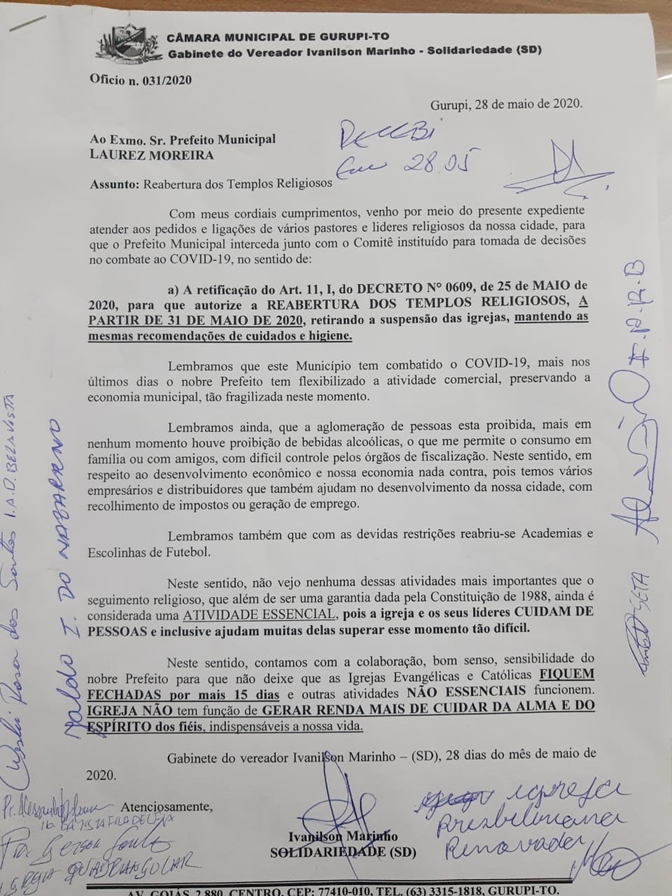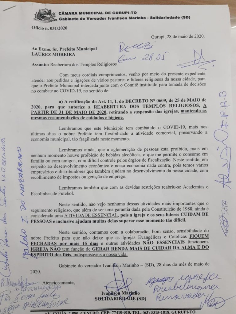 De acordo com Marinho, ele recebeu várias mensagens de líderes religiosos solicitando que a reabertura das igrejas de Gurupi fossem discutidas no Comitê Gestor Municipal.