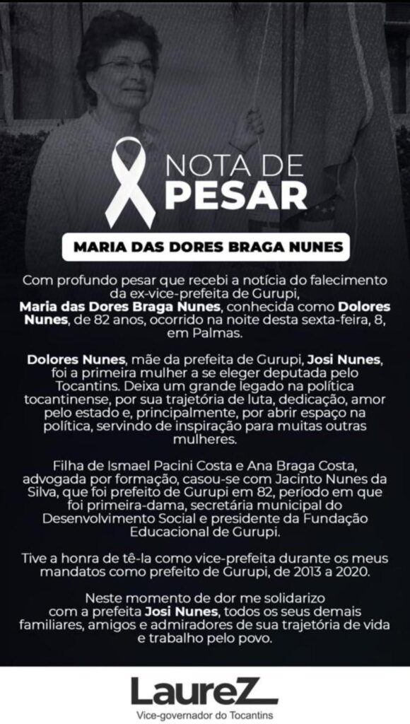 Os nossos mais sinceros sentimentos a prefeita de Gurupi, Josi Nunes, e a nossa amiga Gleyce Nunes, ambas filhas de Dona Dolores. Nos solidarizamos com todos os demais familiares e amigos.