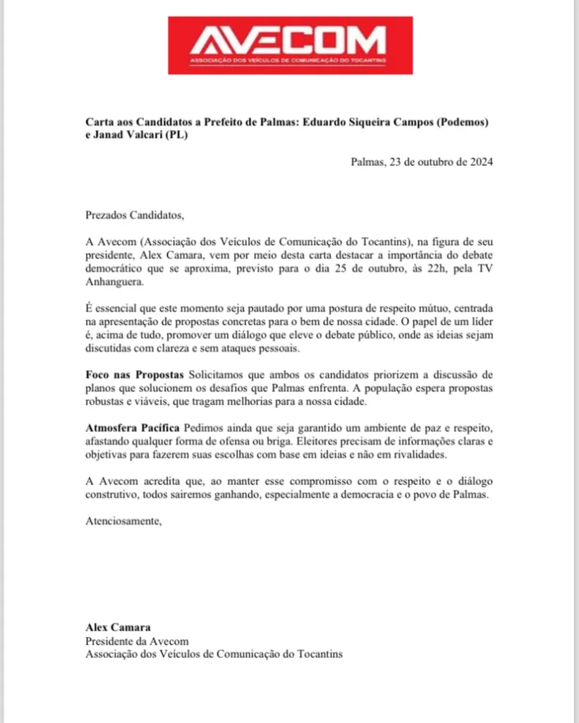 A Associação dos Veículos de Comunicação do Tocantins (AVECOM), representada pelo presidente Alex Câmara, publicou uma carta (leia a eixo) endereçada aos candidatos à Prefeitura de Palmas, Eduardo Siqueira Campos (Podemos) e Janad Valcari (PL).