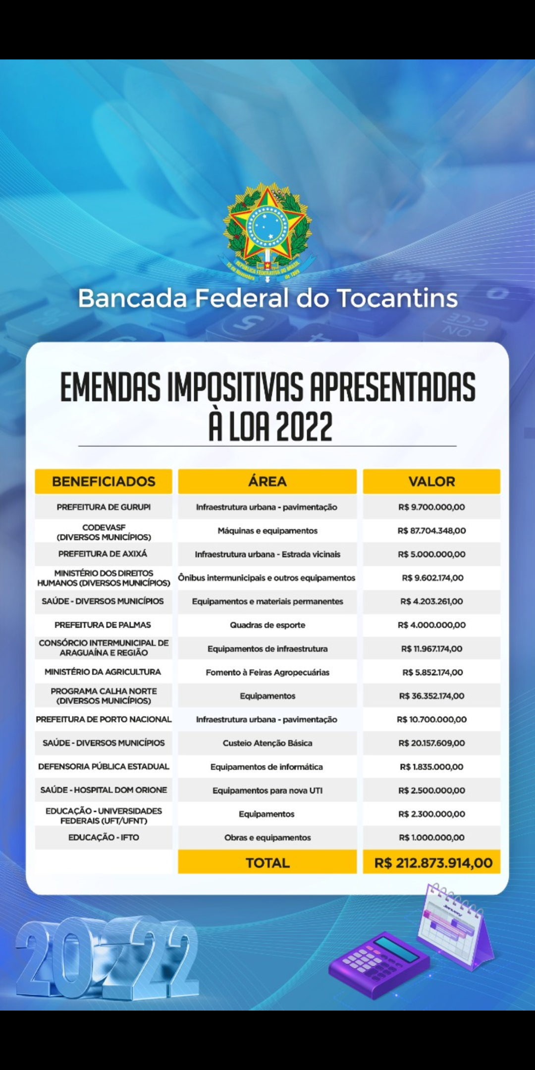Em um trabalho coordenado e conjunto dos 11 congressistas do Tocantins, a Bancada Federal do Tocantins assegurou destinação de R$ 212,8 milhões para oito áreas diferentes do Tocantins. Os recursos virão para o Estado via emendas impositivas de bancadas alocadas ao Orçamento da União de 2022.