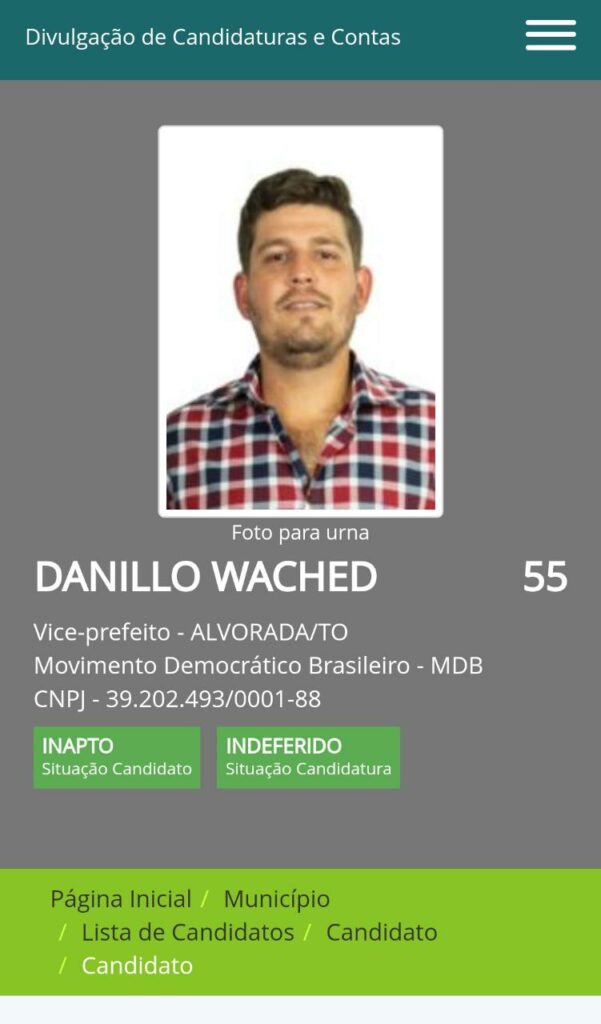 O candidato a vice-prefeito de Alvorada, Danillo Wached (MDB), da coligação PROJETO DE DEUS, VITÓRIA DO POVO teve a sua candidatura impugnada pela Justiça Eleitoral. O motivo do indeferimento foi por causa de condenação criminal com trânsito em julgado perante o Juízo da 1ª Vara Criminal da Comarca de Porto Nacional – TO, em 13 de fevereiro de 2020 pelo crime de porte ilegal de arma de fogo.