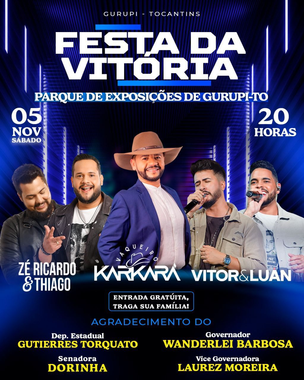 Com atrações nacionais, festa da vitória do Deputado Estadual Gutierres, do Vice-Governador Laurez, do Governador Wandelei e da Senadora Dorinha será em Gurupi