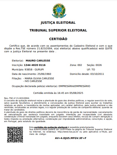 O ex-governador do Tocantins, Mauro Carlesse, deu mais um passo em direção à disputa eleitoral de 2026. No dia 5 de agosto de 2025, ele obteve certidão de quitação eleitoral emitida pelo Tribunal Superior Eleitoral (TSE), confirmando que está plenamente apto a exercer seus direitos políticos e a registrar candidatura nas próximas eleições. A conquista do documento marca o início formal de uma articulação política que vinha sendo conduzida de forma discreta, mas estratégica, em todo o estado.