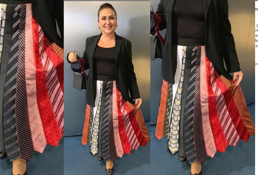 Considerada como símbolo da dominação masculina, as gravatas usadas na confecção da saia da senadora tocantinense foi feita sob encomenda pelo Ateliê Rosana Tavares em Palmas.