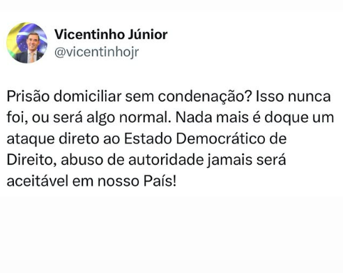 O deputado federal Vicentinho Júnior se manifestou recentemente sobre a prisão domiciliar do ex-presidente Jair Bolsonaro, expressando sua preocupação com a medida. Segundo Vicentinho Júnior, a prisão domiciliar sem condenação é um “ataque direto ao Estado Democrático de Direito” e um “abuso de autoridade” que não deve ser aceitável no país.