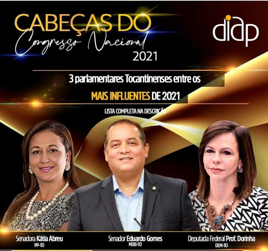Três parlamentares do Tocantins estão no topo do Congresso Nacional definidos pelo Departamento Intersindical de Assessoria Parlamentar (Diap), que congrega os mais influentes nomes do Parlamento brasileiro. São eles os senadores Eduardo Gomes (MDB-TO), e Kátia Abreu (PP) e deputada federal Dorinha Seabra Rezende (DEM-TO).