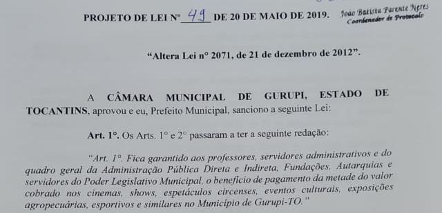 A Lei 2071, aprovada na gestão do ex-prefeito Alexandre Abdalla dava garantia apenas da meia-entrada para os professores e servidores administrativos da Prefeitura, mas agora com o PL 49 que altera a lei todos os servidores do quadro geral da administração público direta e indireta, Fundações, Autarquias e servidores do Poder Legislativo Municipal poderão ser beneficiados com o benefício de pagamento da metade do valor cobrado em cinemas, shows, espetáculos circenses, eventos, exposições agropecuária, esportivos e similares no município de Gurupi.