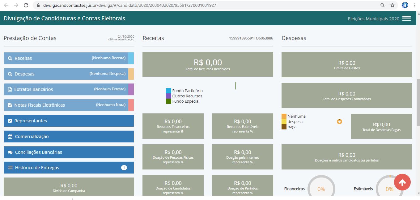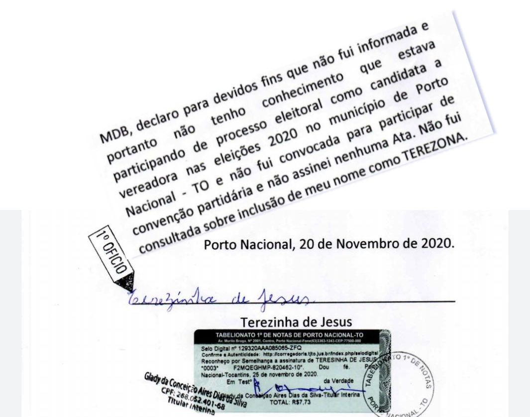 Em declaração com assinatura reconhecida em cartório, a candidata a vereadora, Terezinha de Jesus (MDB) alega que “não teve conhecimento que estava participando do processo eleitoral como candidata a vereadora por Porto Nacional e que não foi convocada para participar de convenção partidária e que não assinou nenhuma Ata”. Conforme o TSE, a aposentada e viúva, dona Terezinha aparece com o nome de Terezona e não teve nenhum voto, não declarou receita como fundo partidário, despesa, assim como também não declarou relação de bens.