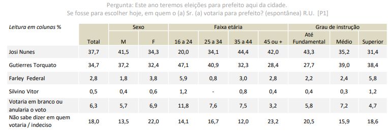 Na espontânea em que não são apresentados os nomes dos candidatos, a candidata Josi Nunes aparece com 37,7% das intenções de votos, seguida por Gutierres Torquato com 34,7%, Farlei Federal com 2,8% e Silvino Vitor com 0,5%.