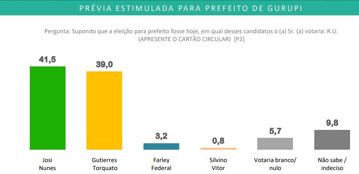 Na abordagem estimulada que mostra em um disco os nomes dos candidatos, Josi Nunes aparece com 41.5%, Gutierres Torquato com 39%, Farley Federal com 3.2% e Silviono Vitor com 0,8%.