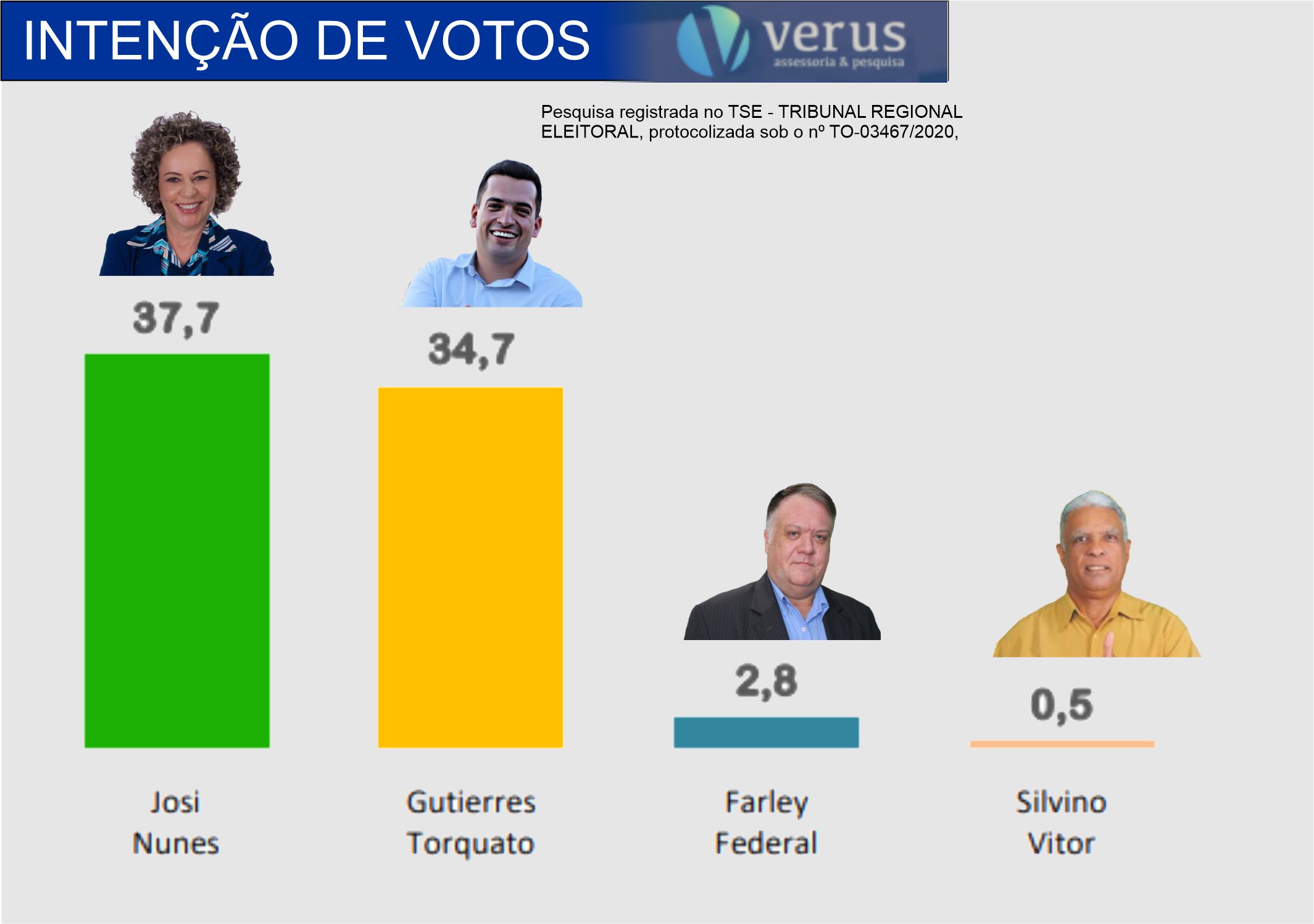 Na primeira rodada da pesquisa Verus/Portal Atitude, a candidata Republicana, Josi Nunes (PROS), encontra-se 37,7% e o Socialista, Gutierres Torquato (PSB) com 34,7% na espontânea. Na estimulada Josi Nunes aparece com 41,5% e Gutierres com 39%. A pesquisa mostra ainda que Torquato é o preferido do público jovem entre 16 a 34 anos, enquanto Josi Nunes se posiciona melhor no público acima de 35 anos. Confira os resultados da pesquisa registrada no Tribunal Superior Eleitoral (TSE), protocolizada sob o nº TO03467/2020.