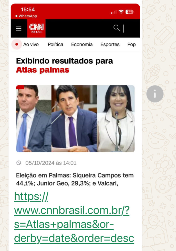 A CNN Brasil removeu de seu site uma matéria que destacava os resultados de uma pesquisa eleitoral realizada pela Atlas Intel, a mesma alvo da Justiça Eleitoral do Tocantins que suspendeu a divulgação de enquetes irregulares. No lugar da matéria, a CNN publicou o resultado da nova pesquisa Big Data, que restabelece a candidata Janad Valcari (PL) com 52% das intenções de voto e à frente na disputa pela Prefeitura de Palmas.