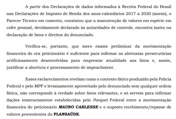 No documento os advogados do governador afastado defendem que todos os valores questionados na investigações, como supostas  propinas relativas aos contratos do Plansaúde para negociações de interesse que envolviam a região do jalapão foram declarados por Mauro Carlesse à Receita Federal e são “decorrente de disponibilidade financeira própria (acumulada no decorrer dos anos anteriores) e foi devidamente declarada, não sendo juridicamente possível cogitar-se de lavagem de dinheiro nesse contexto”.