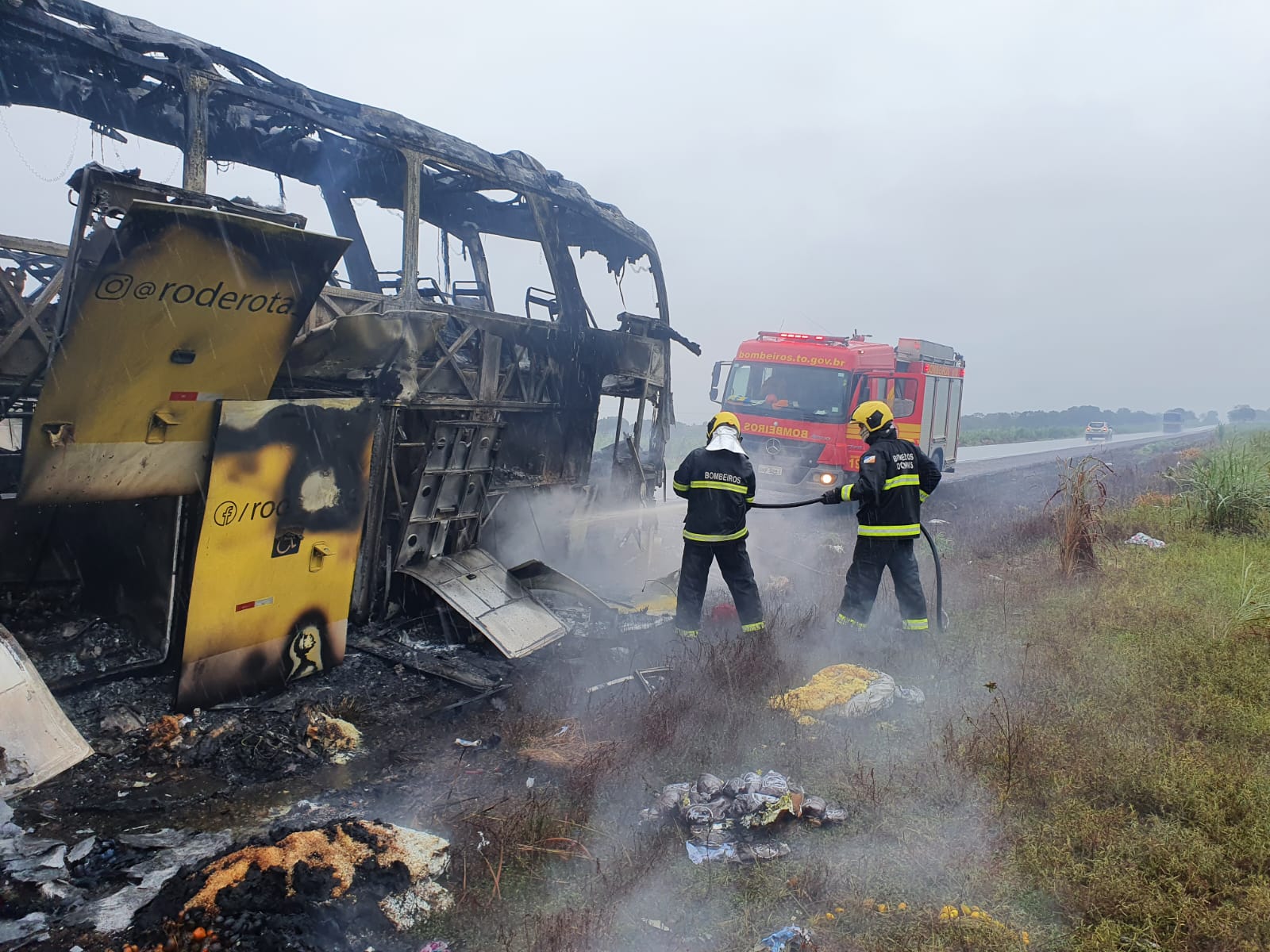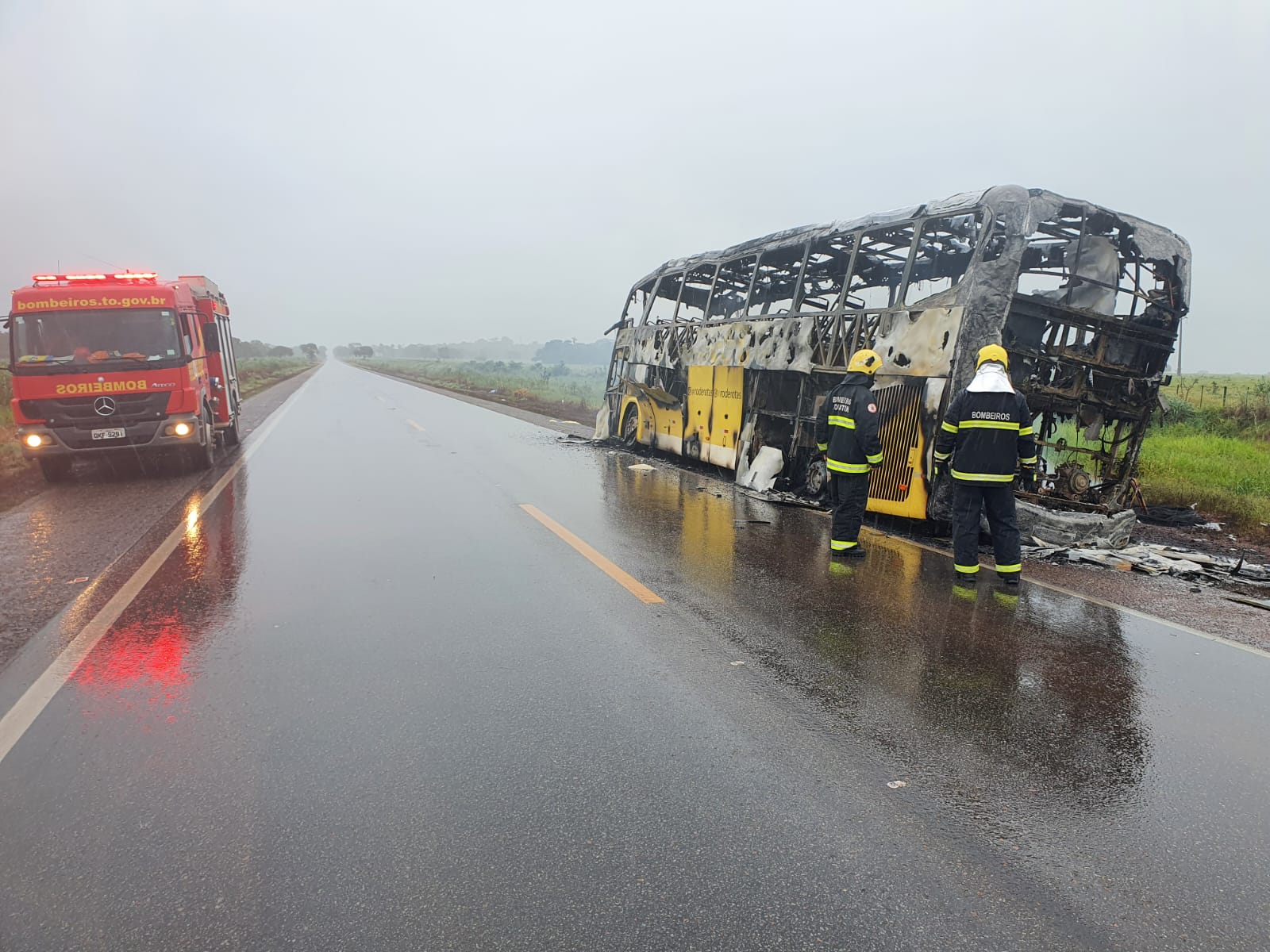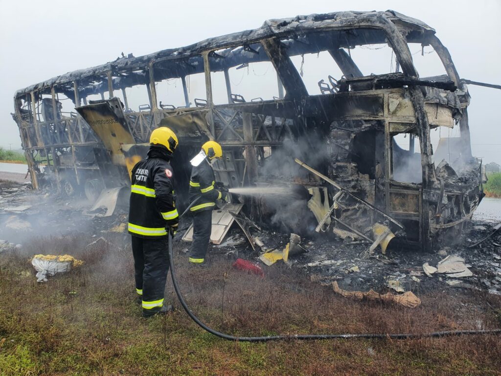 “No local o ônibus estava no acostamento da pista já com o incêndio controlado, utilizamos o Caminhão de combate a incêndio para então fazermos o rescaldo nos pequenos focos que ainda restavam, para que o veiculo incendiado fosse rebocado da BR-153 com segurança”, destacou o Corpo de Bombeiros.