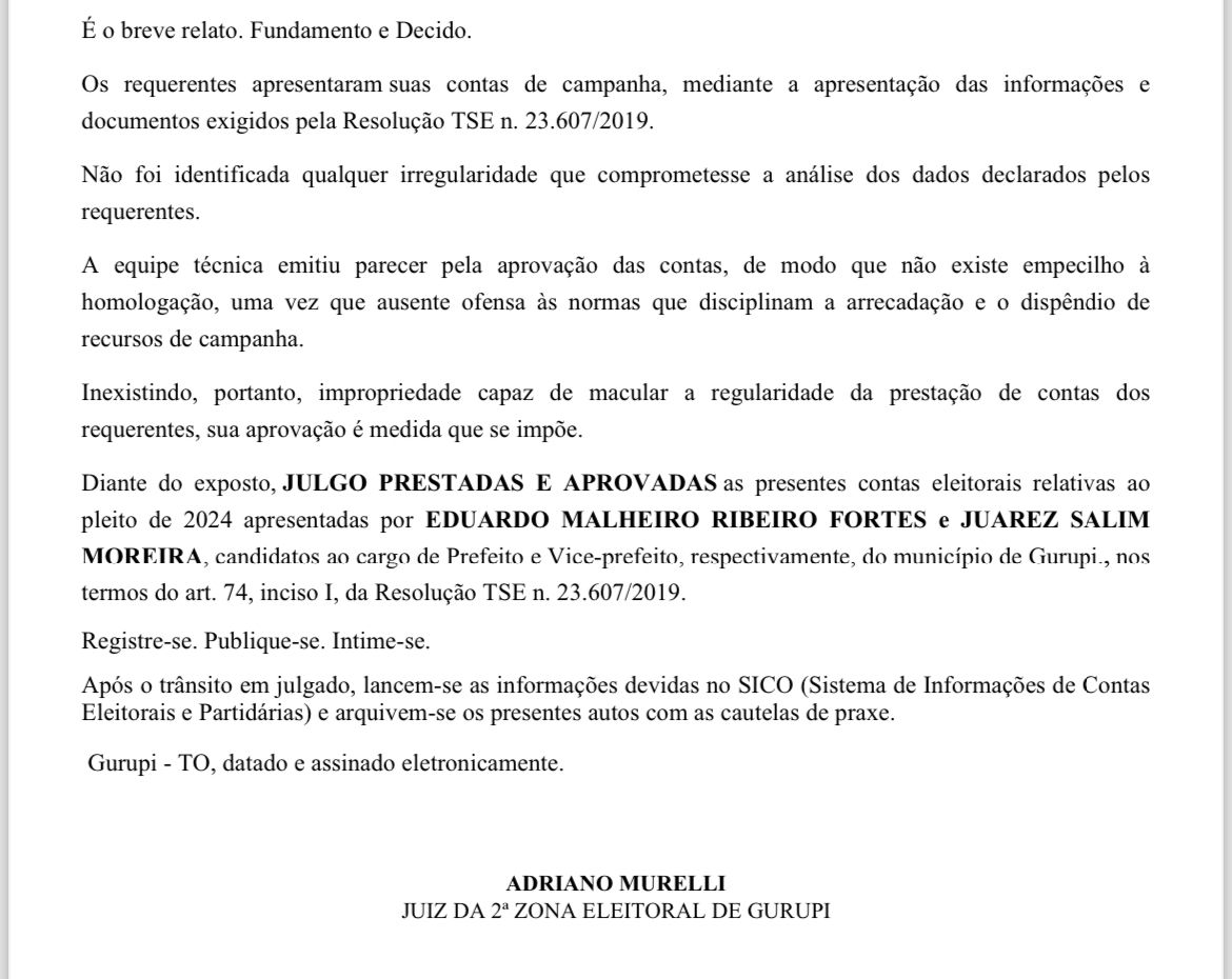 O Tribunal Regional Eleitoral (TRE), por meio do Juiz da 2ª Zona Eleitoral de Gurupi, Dr. Adriano Murelli, aprovou as contas da campanha de Eduardo Fortes e Juarez Moreira, candidatos a prefeito e vice-prefeito na última eleição municipal. A decisão confirmou a regularidade e a transparência na condução dos recursos utilizados durante o processo eleitoral.