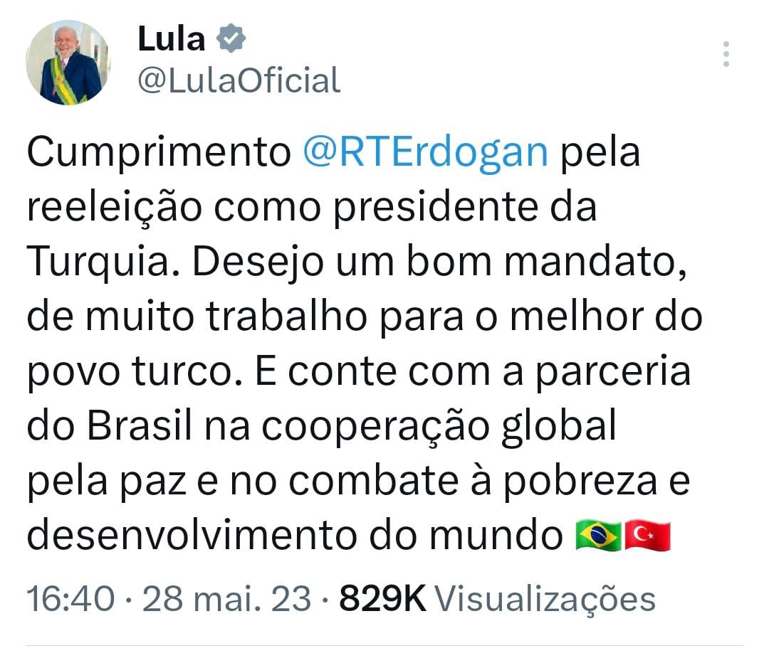 Pelas redes sociais, o presidente do Brasil, Luiz Inácio Lula da Silva, cumprimentou o líder turco Tayyip Erdogan pela reeleição. “Cumprimento @RTErdogan pela reeleição como presidente da Turquia. Desejo um bom mandato, de muito trabalho para o melhor do povo turco. E conte com a parceria do Brasil na cooperação global pela paz e no combate à pobreza e desenvolvimento do mundo”.