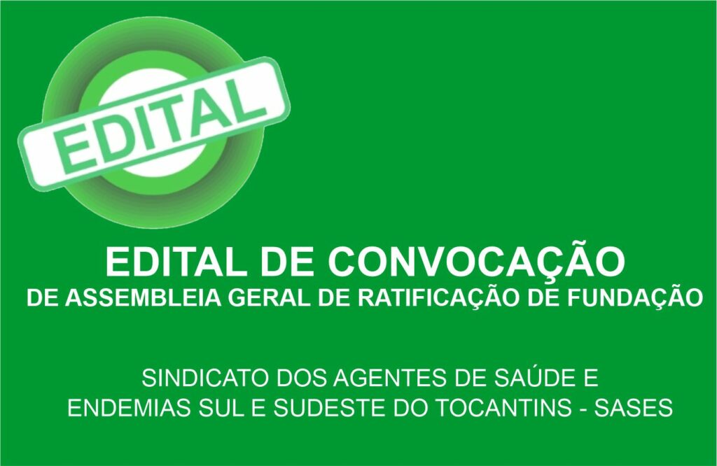 EDITAL DE CONVOCAÇÃO DE ASSEMBLEIA GERAL DE RATIFICAÇÃO DE FUNDAÇÃO DO SASESPor Atitude Tocantins17 de novembro de 2021 - 07:05SINDICATO DOS AGENTES DE SAÚDE E ENDEMIAS SUL E SUDESTE DO TOCANTINS EDITAL DE CONVOCAÇÃO…