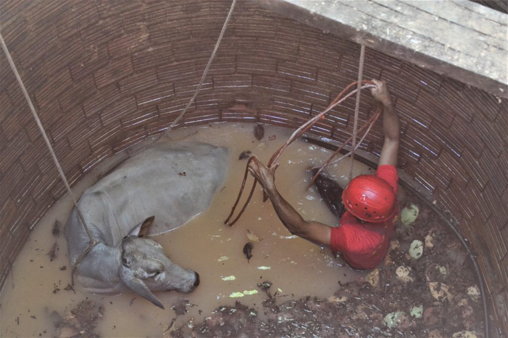 Ação durou cerca de duas horas, com equipe de salvamento tirando o animal com vida…
